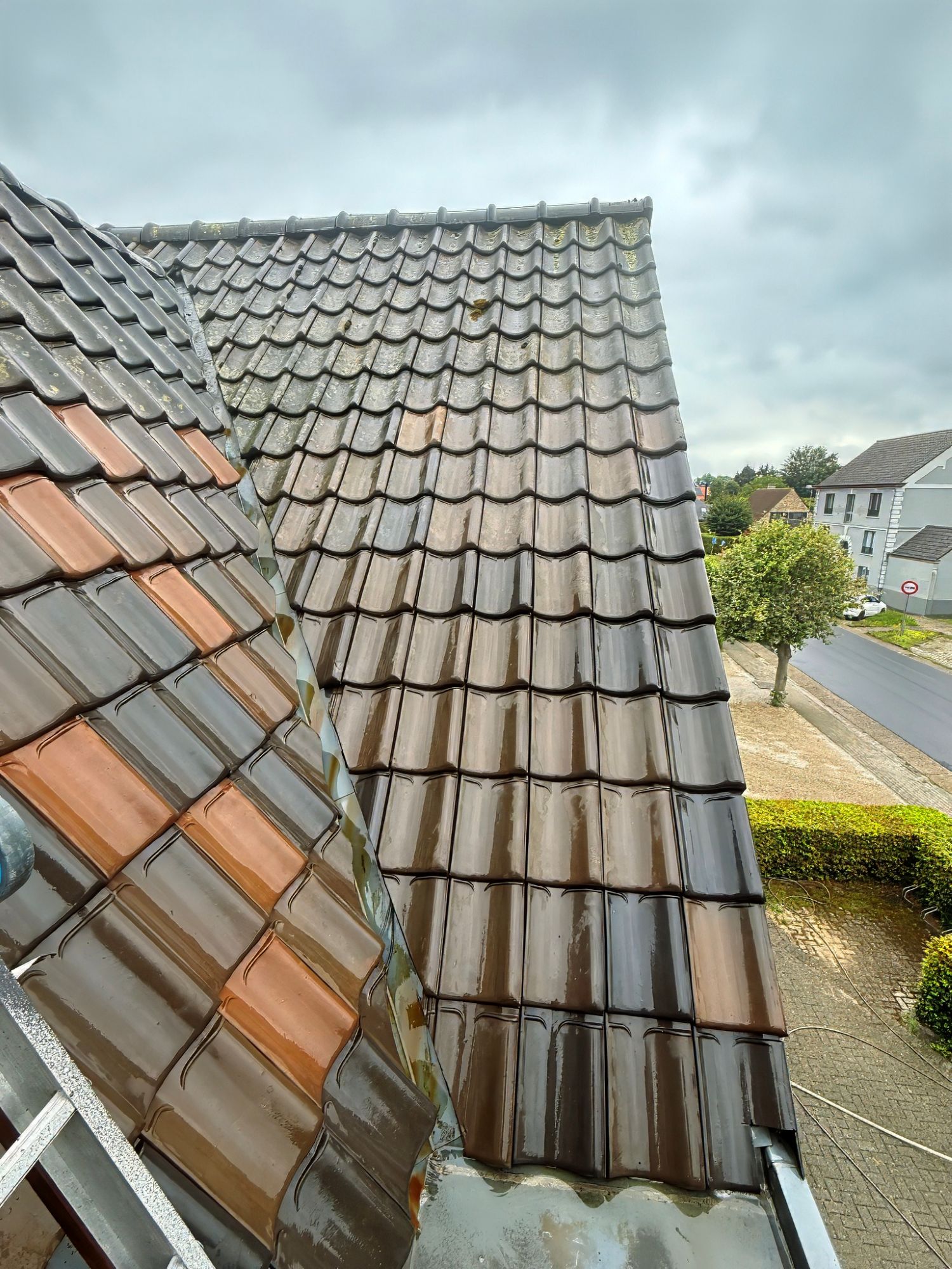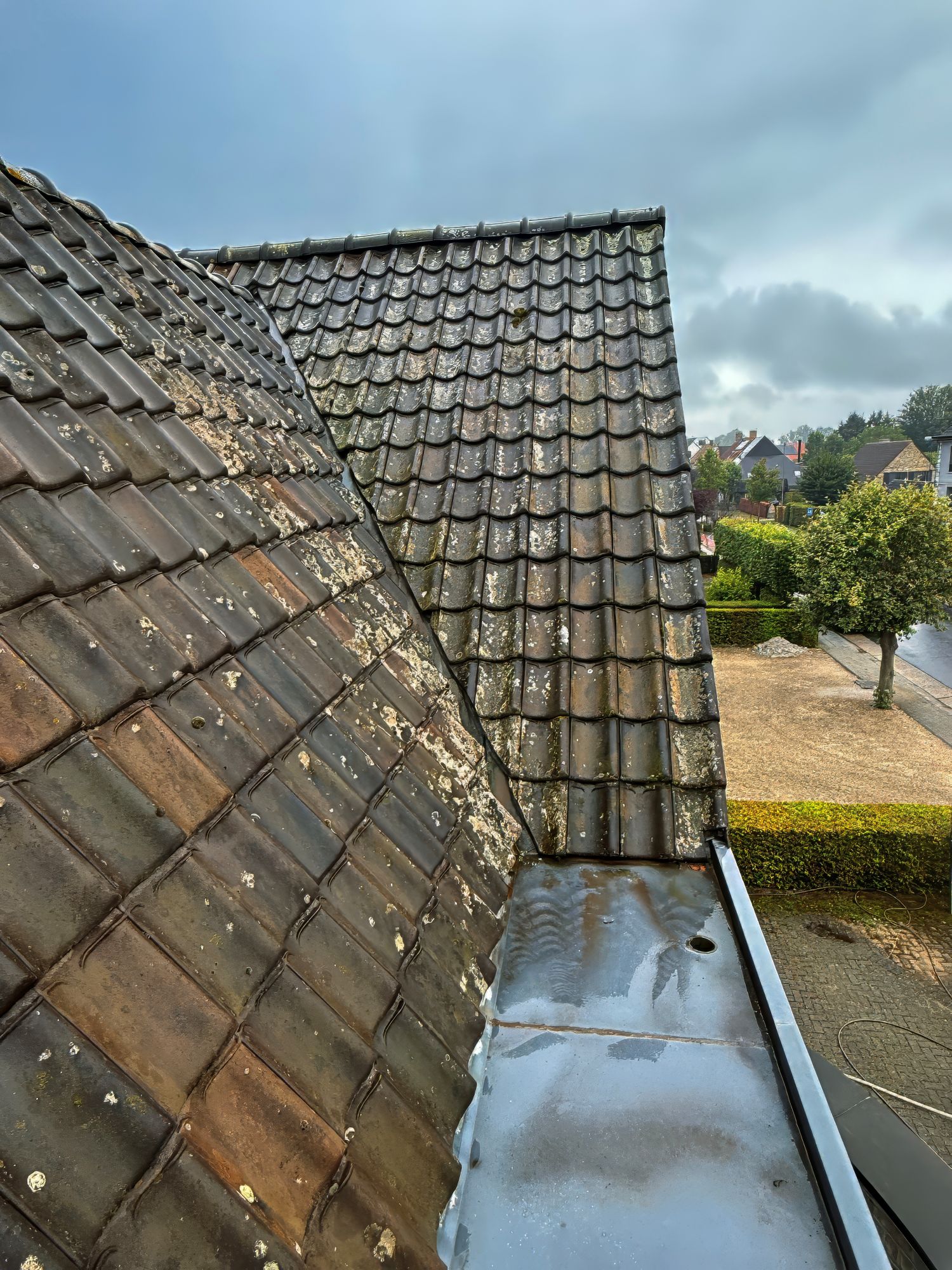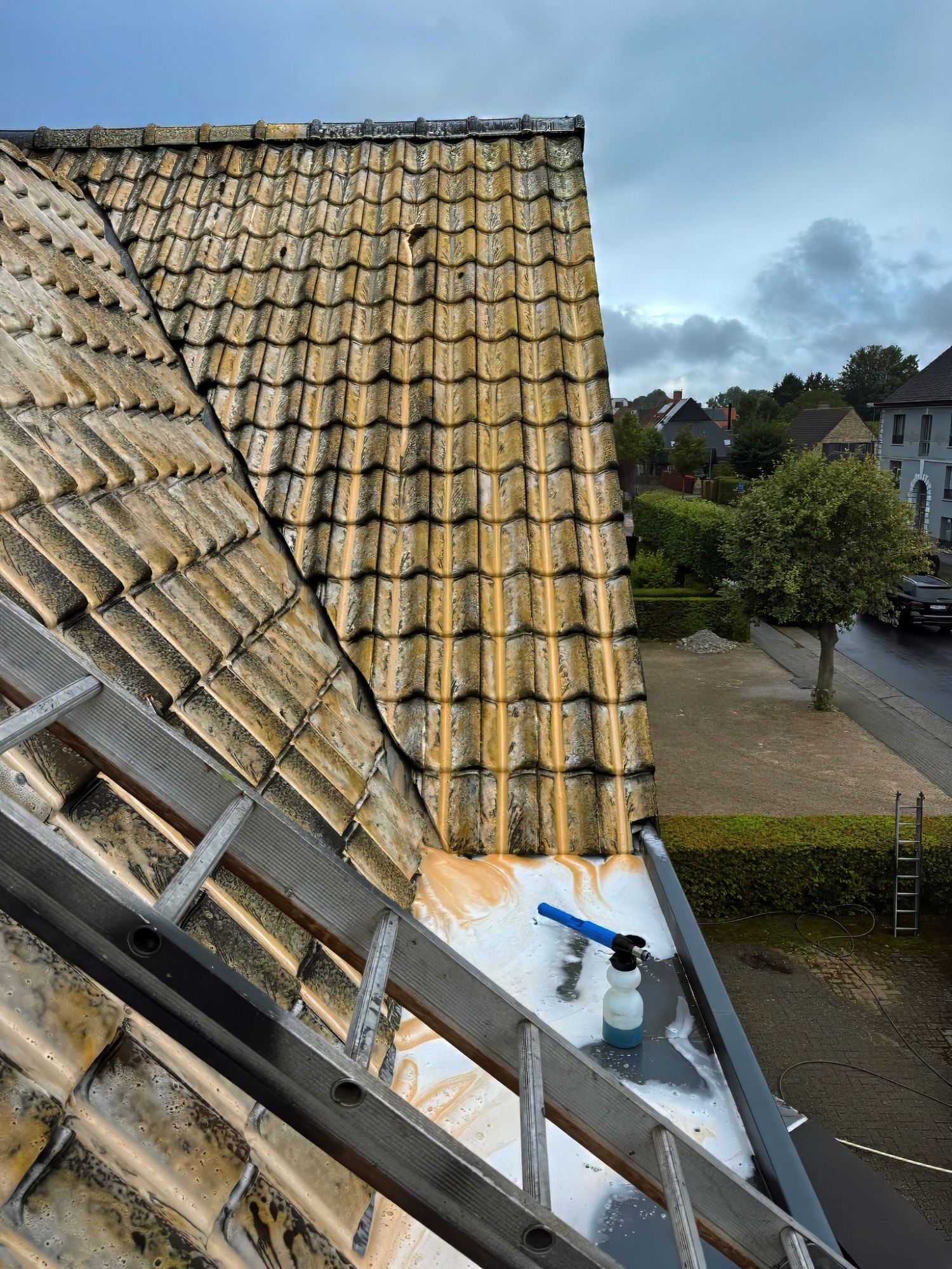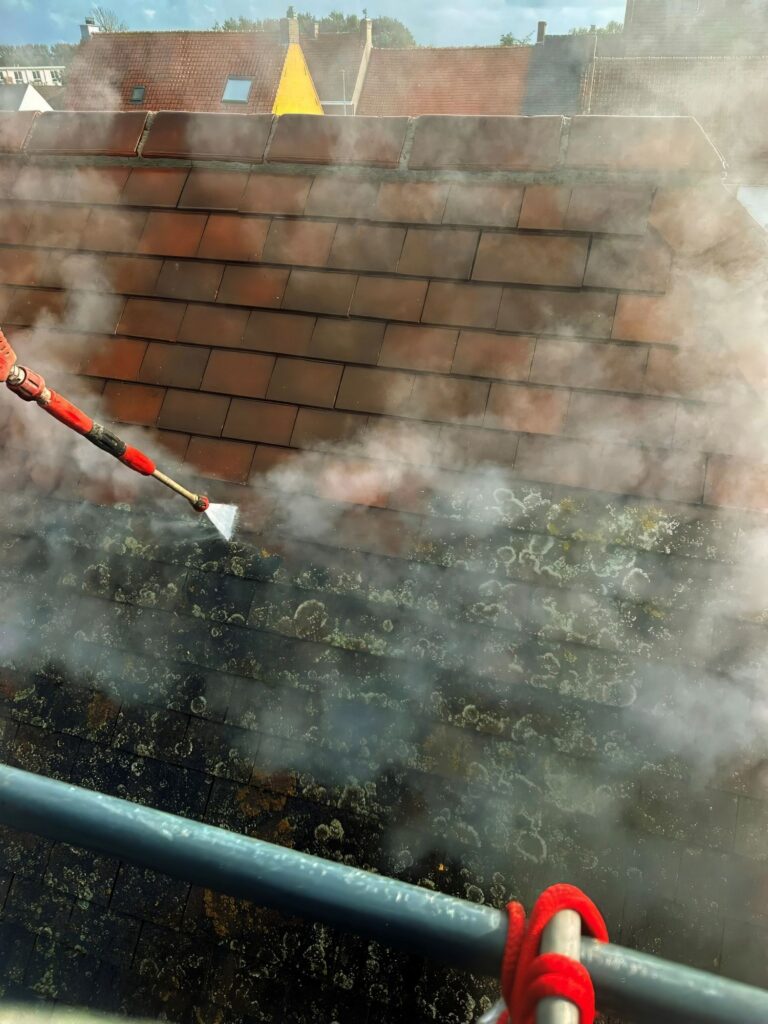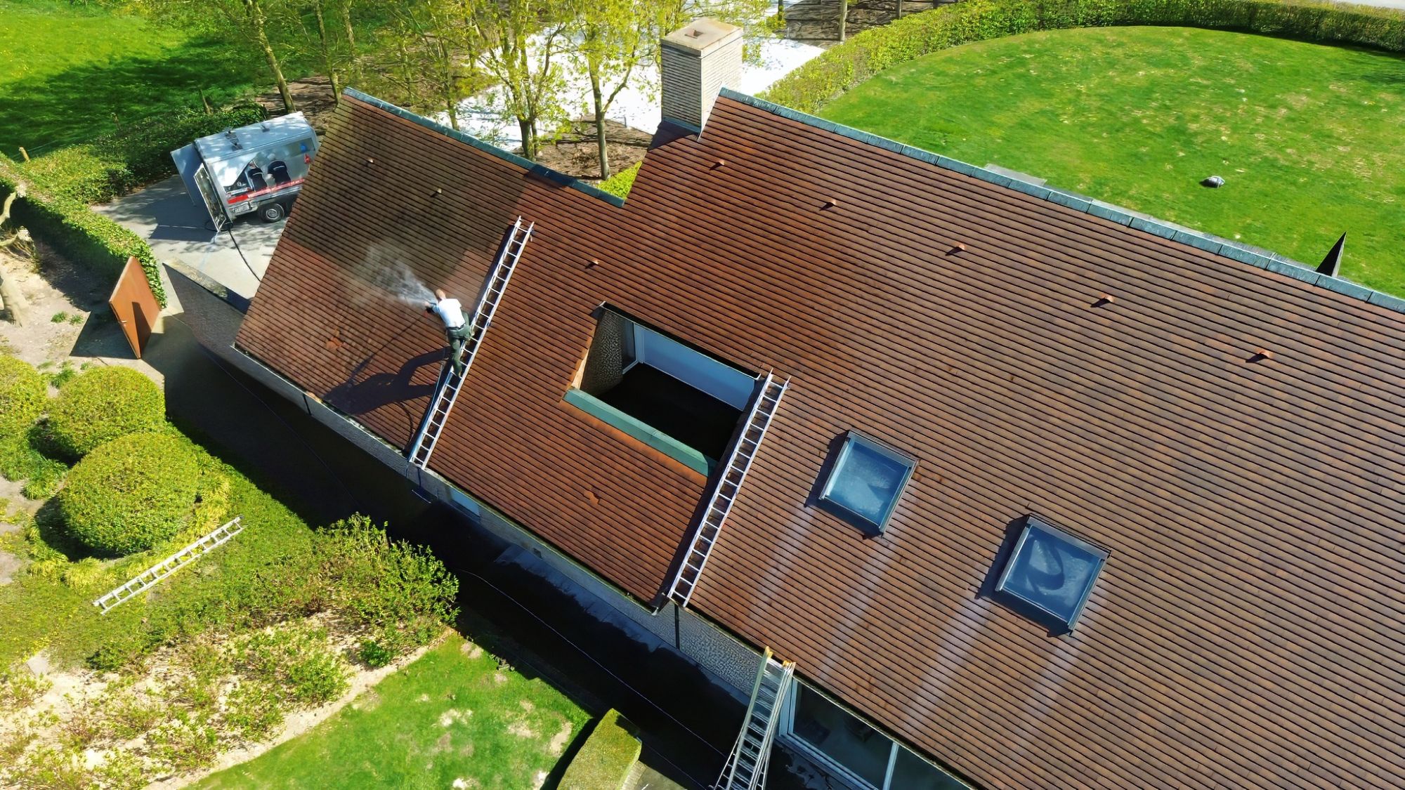 Met behulp van heet water (stoomtechniek) of gepaste druk spuiten we het dak van boven naar beneden schoon. Door gebruik te maken van roterende vuilfrezen verwijderen we mos, korstmossen en atmosferische vervuiling tot diep in de poriën.